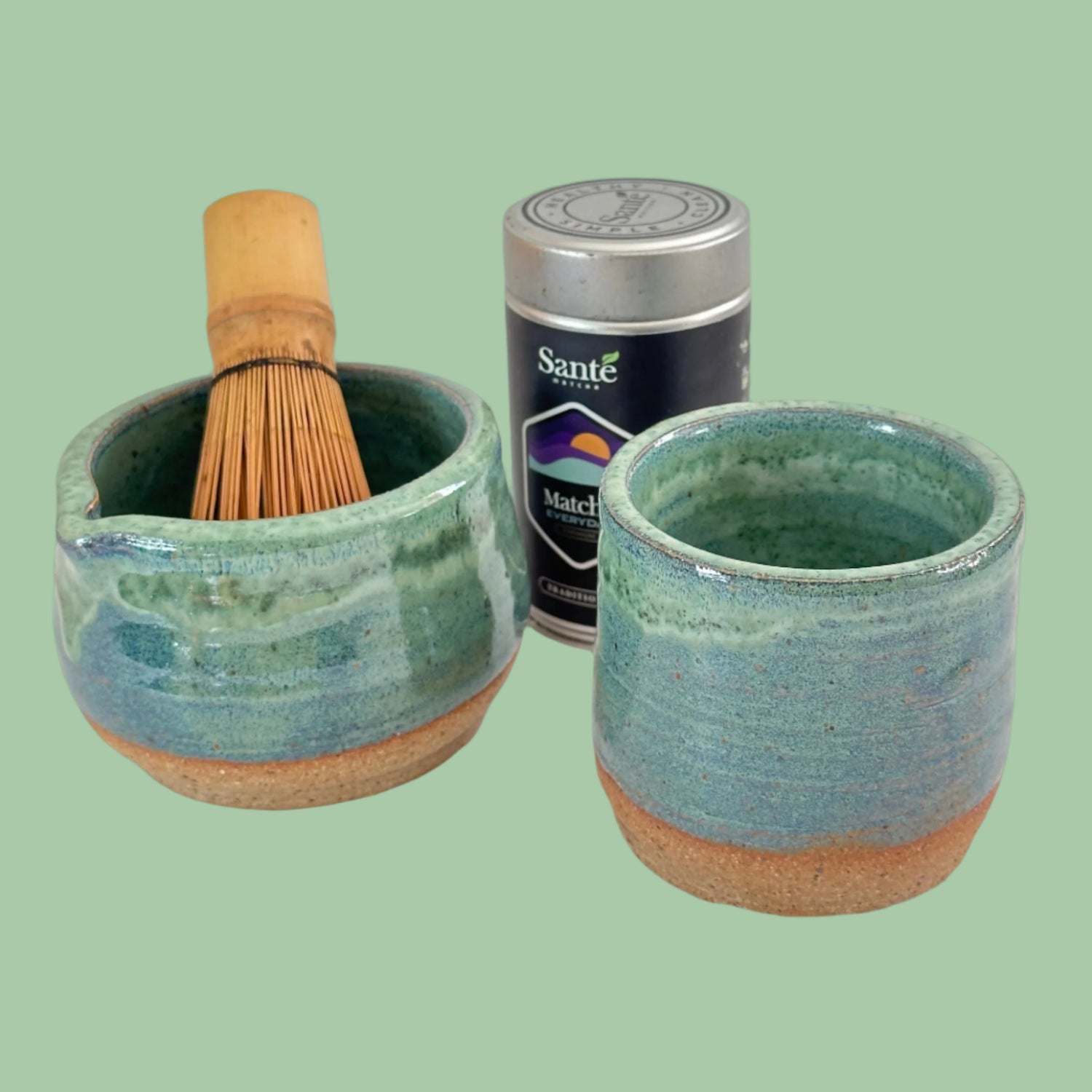 Shop handmade matcha sets with a bowl for whisking and a mug for drinking. A great addition to any kitchen.